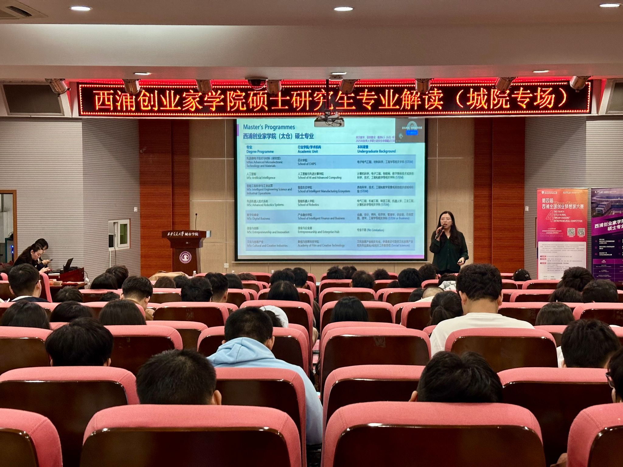 会后,来访人员在F100报告厅为计算机学院、电气信息学院和智能制造与新能源学院大三、大四学生举办了研究生专项讲座,介绍了新型融合专业的未来发展与就业前景,解读了人工智能、先进微电子技术与材料、创业与创新等七大硕士专业的特色及申请政策。讲座期间,西浦创新与创业港Mustafa Ozguven副教授通过线上连线方式与现场学生互动,介绍了“西浦创新创业大赛”的有关情况,并鼓励学生积极参赛、勇于创新,在更广阔的平台展现才华。现场互动踊跃,气氛热烈。