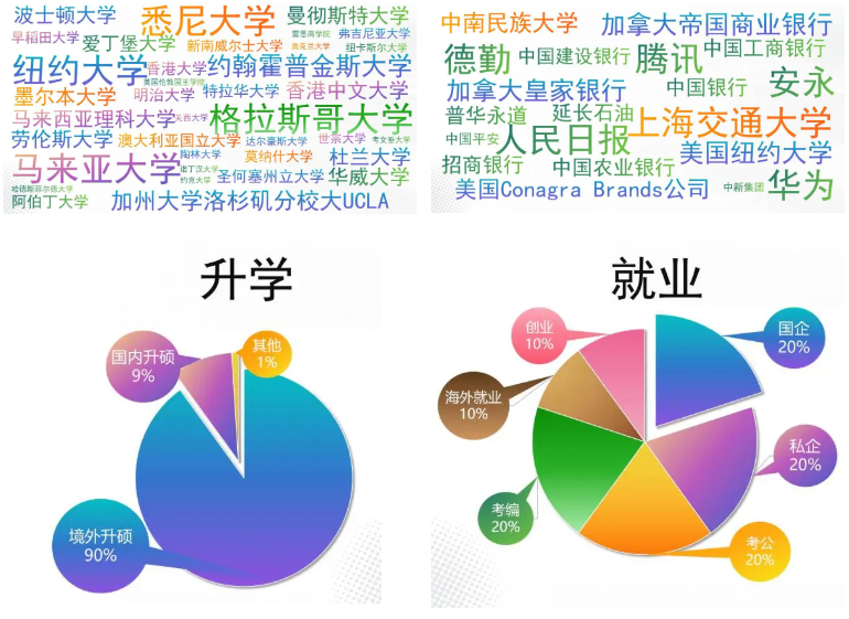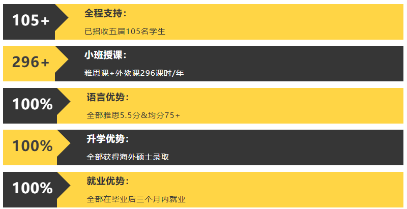 学校积极发挥中外课程联合培养优势,以国际教育标准,构建国际接轨的实践性课程体系,创建本升硕国际班,旨在从大一开始为后续硕博深造奠定扎实基础。国际班的英语课采用雅思(IELTS)体系教学,口语课采用全英外教授课,深化多学科交叉融合教育。学生前3年国内学习,第4年选择“3+1本升硕”以最快四年获得中国本科和国外合作院校硕士研究生;或者第4、5年选择“3+1+1本升硕”以最快五年获得中国本科、国外本科和QS世界前二百国外名校的硕士研究生,实现学历提升的捷径。
