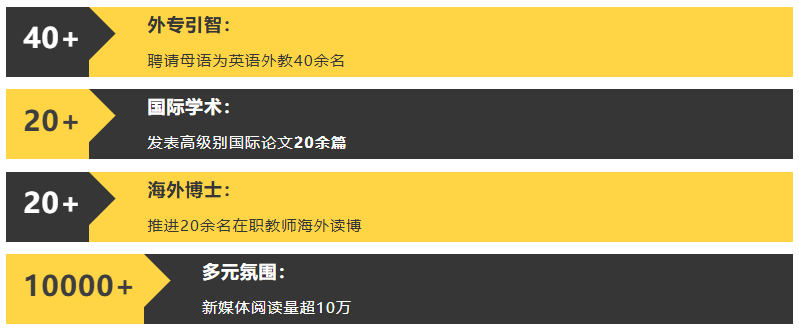 学校认真贯彻落实国家外专引智工作的要求,聚焦于科教协同推动教育教学改革发展的总目标,保证每年2-3名外专引智数量,目前,已累计聘请来自美国、日本、英国、澳大利亚、保加利亚、巴基斯坦等十余个国家的近四十名外国专家,不定期开展主题丰富的全英文学术讲座,旨在通过一系列高质量的全英文主题活动,为全校师生搭建一个多元化的学习平台学习和交流平台,积极营造学校国际化氛围。
